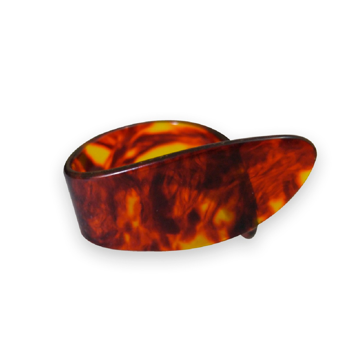 A DD-10 possui um design semiaberto em celulóide, que permite um ajuste firme em diferentes tamanhos de dedos. Ela é projetada para abraçar o polegar de forma confortável, garantindo que não saia durante o uso intenso, mas sem apertar excessivamente.